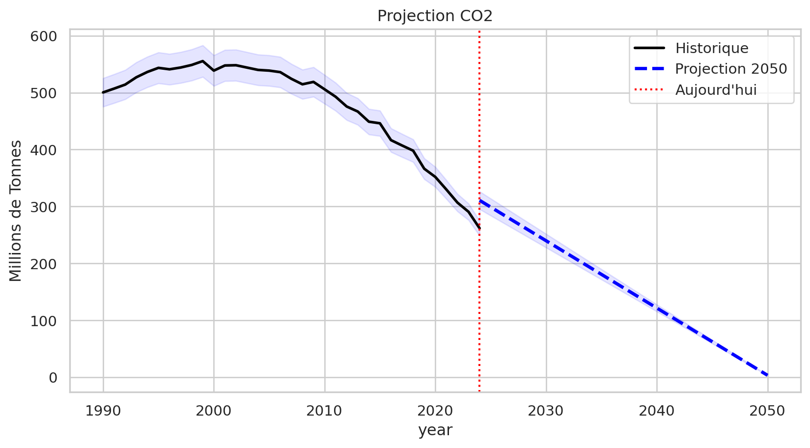 - Interprétation : La France suit une trajectoire de décroissance structurelle. Le modèle prévoit une baisse continue, passant sous la barre des 250 Mt d’ici 2040. Cela valide l’efficacité des politiques de transition énergétique, bien que des efforts supplémentaires soient requis pour la neutralité carbone totale.