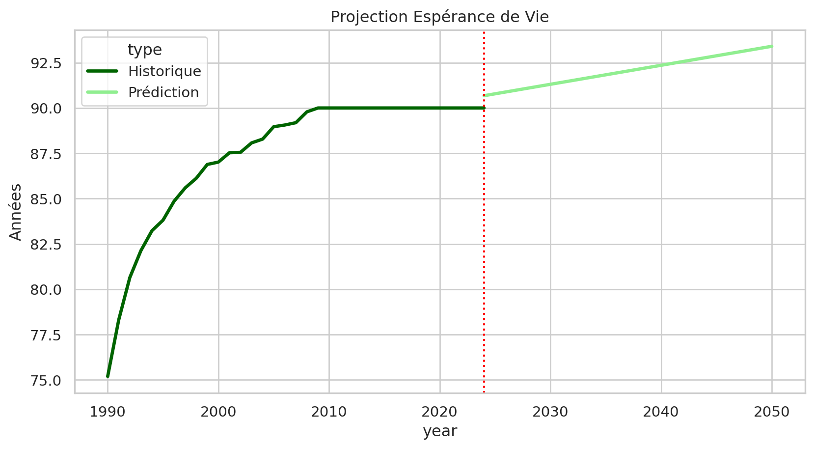- Interprétation : Le modèle est optimiste et projette un gain continu, dépassant potentiellement les 84 ans de moyenne d’ici 2040. Cependant, cette courbe pourrait s’aplatir (effet de plateau biologique) non pris en compte par une régression linéaire simple.